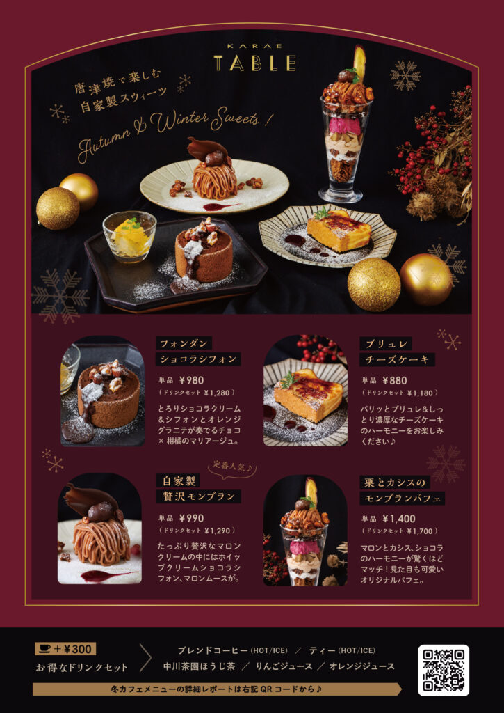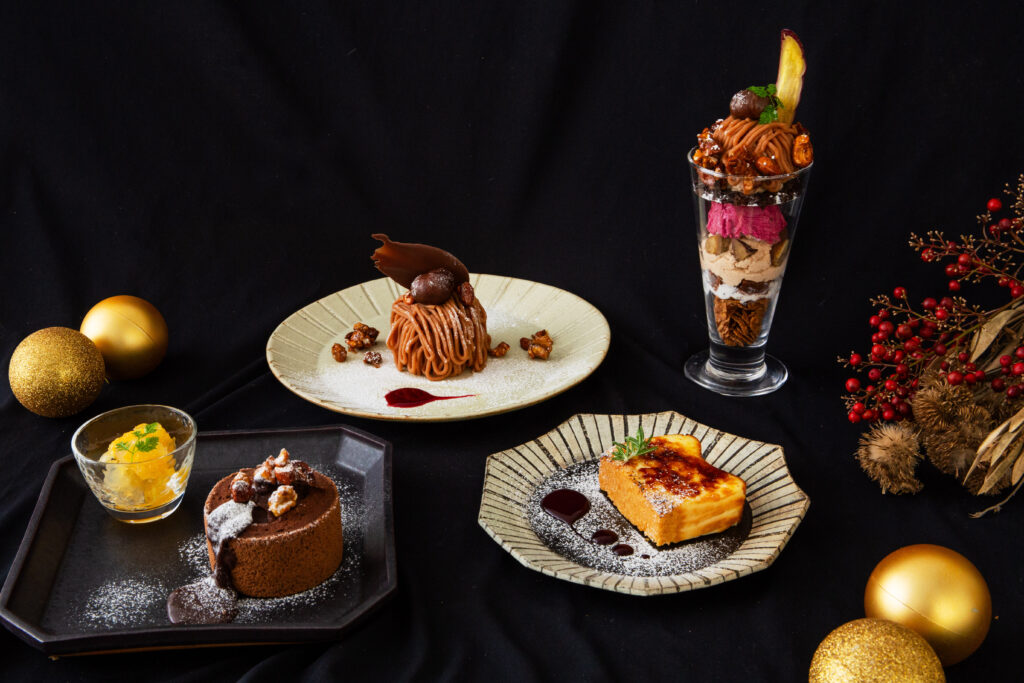 KARAE1階のカフェ&ダイニング「KARAE TABLE」では、季節ごとに登場する限定スイーツが毎年大人気。秋冬メニューでは、濃厚で贅沢な味わいの手作りケーキやパフェが勢ぞろいしています。