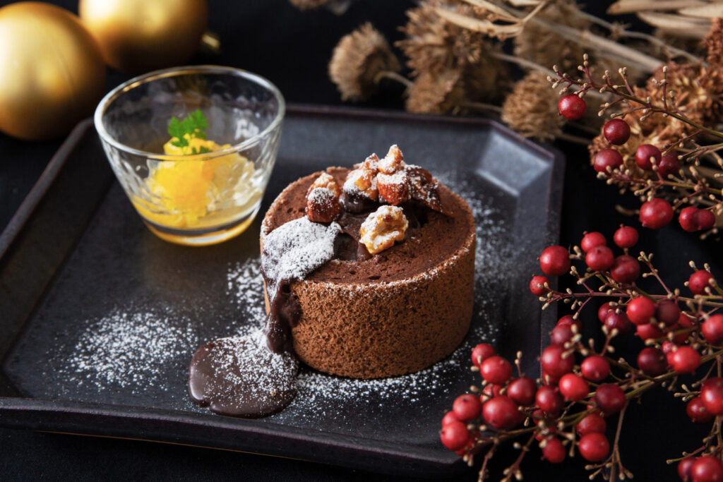 冬スイーツの代表格が、この「フォンダンショコラ」。ふわっと軽やかなショコラシフォンの中から、とろりと溶け出す温かいチョコレートクリーム、ひと口ごとに広がる濃厚な甘みと、爽やかな柑橘の香りが見事に調和します。トッピングのヌガーナッツが香ばしいアクセントを添え、さらに特製のデコポングラニテが後味をさっぱりと引き締めてくれます。
