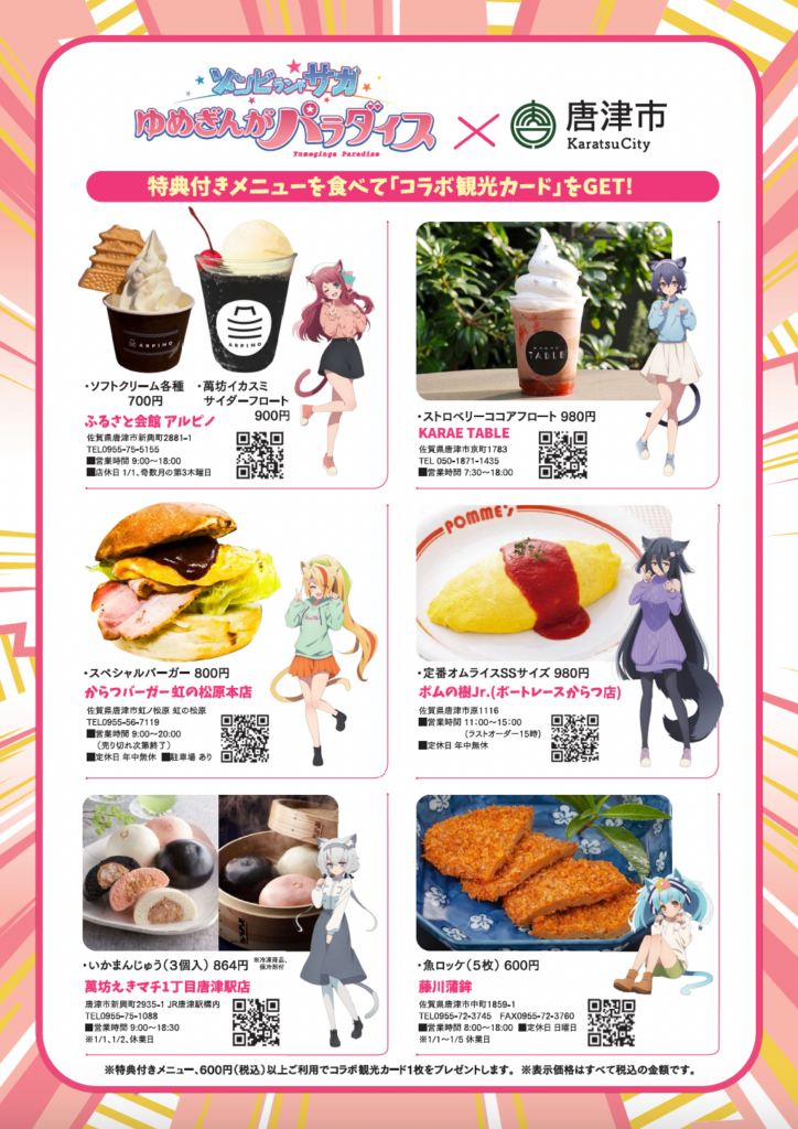 キャンペーン対象は、唐津市内の飲食店など全6店舗。各店舗でコラボメニューを注文すると、店舗ごとに異なる観光カードを1枚入手できます。また、唐津の観光名所「唐津城」「唐津神社」の2か所では、観光カードを無料配布中。