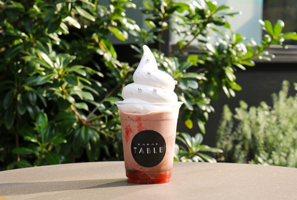いちご×ココアのやさしい甘さのドリンクに、唐津っ子おなじみの地元ブランド「村山牛乳」の濃厚ソフトクリームをたっぷりトッピング。ボリューム満点で、満足感のある一杯です。