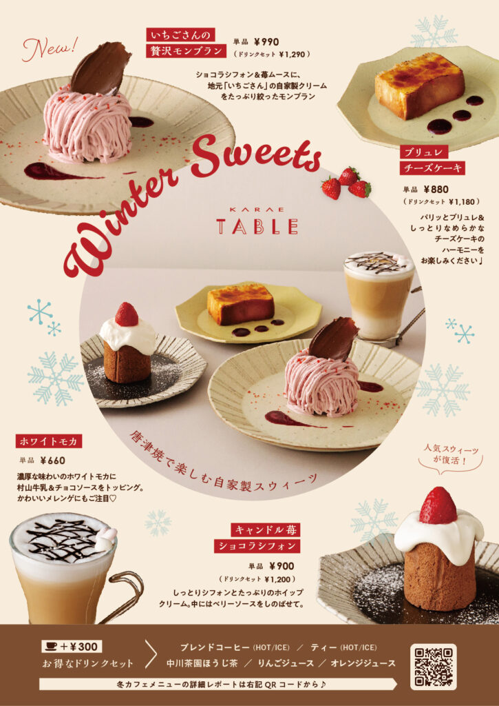 新作ケーキに心もときめくホットドリンク、そしてファン待望の復刻スウィーツまで、みんなで楽しめるラインナップです。提供の器には地元の伝統工芸品である唐津焼を使用して、やきもの文化を感じられます。KARAE TABLEがお届けする、この冬だけの特別なスウィーツをぜひご賞味あれ。