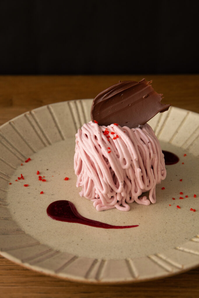 KARAE TABLE大人気の自家製モンブランケーキが、この冬限定でいちごに大変身。ほろっと軽やかなメレンゲにふわふわのココアシフォンを乗せて、なめらかな苺ムースをたっぷりとはさみました。さらに唐津の農家で大切に育てられた佐賀県産ブランド苺「いちごさん」をふんだんに使用した、甘酸っぱいクリームを贅沢に絞って、繊細な味わいに。一口含めば苺の香りが口いっぱいに広がって、柔らかなクリームがとろけます。 酸味のきいたベリーソースと絡めれば程よいアクセントに。