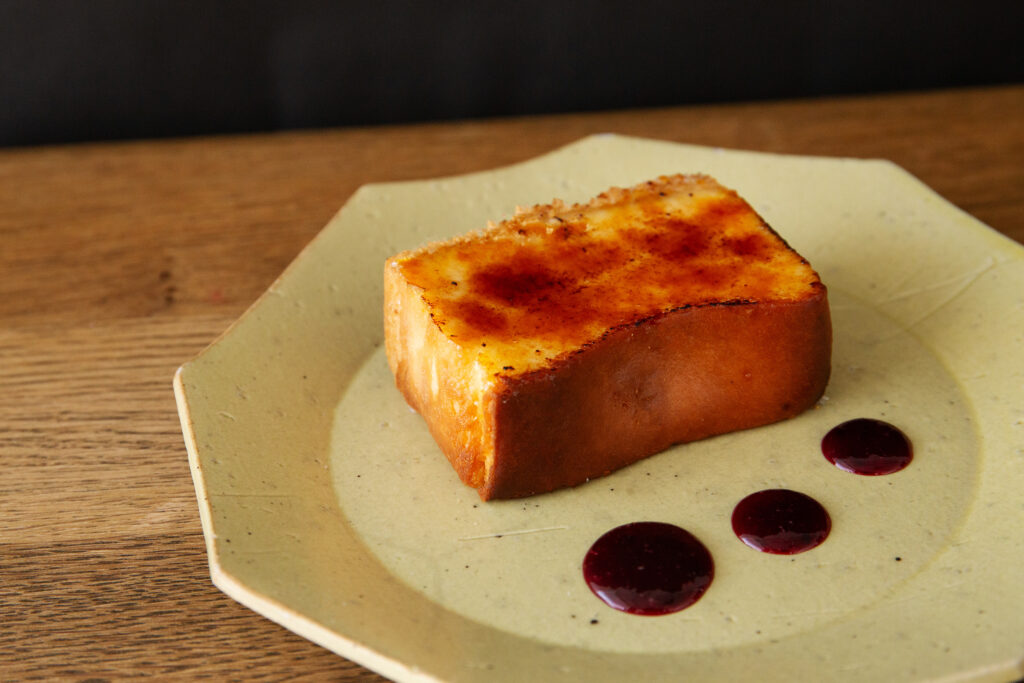 KARAE TABLE定番スウィーツの自家製チーズケーキをリッチにアレンジした「ブリュレチーズケーキ」は、ファンのリクエストにお応えして引き続きご提供。しっとり濃厚なチーズケーキをブリュレして、カリッと香ばしいキャラメルで包みました。甘酢っぱいベリーソースとあわせれば、チーズのまろやかな風味が一層際立ちます。土台のクッキー生地は楽しいザクザク食感で、食べる人を飽きさせません。リピーター続出中のブリュレチーズケーキ、必食です。