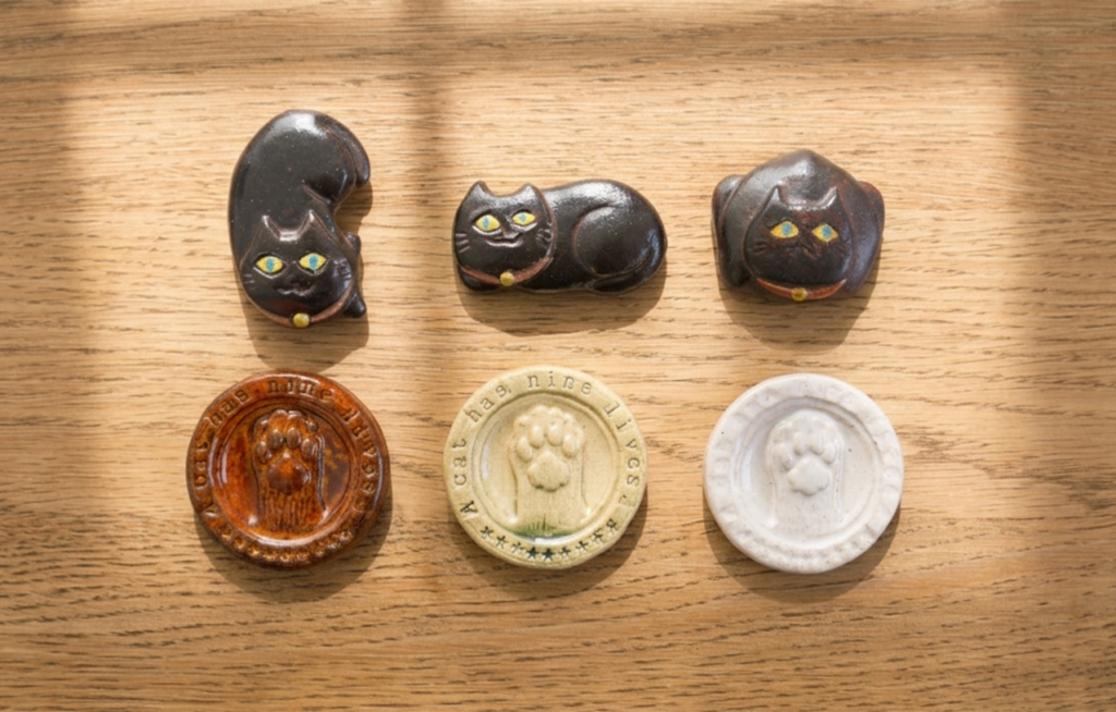 唐津・鏡山の麓に窯を構える「赤水窯」熊本象さん。長年ねこと暮らしてきた作家によるねこアイテムは、身近なねこたちがモチーフです。コロンとしたフォルムと愛らしい表情が魅力で、猫好きの方はもちろん幅広い世代に親しまれています。マグネットやお箸置き、ブローチ、カトラリーレストなど、日常に取り入れやすいアイテムが揃います。
