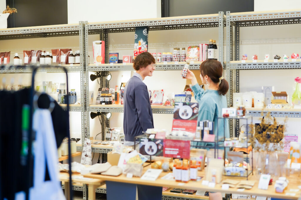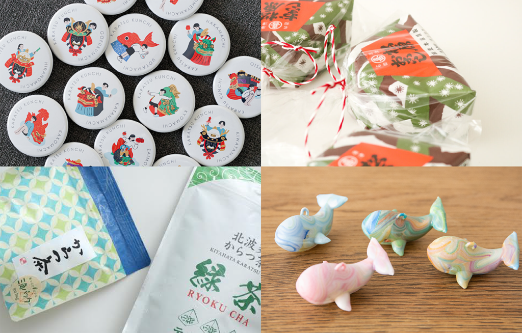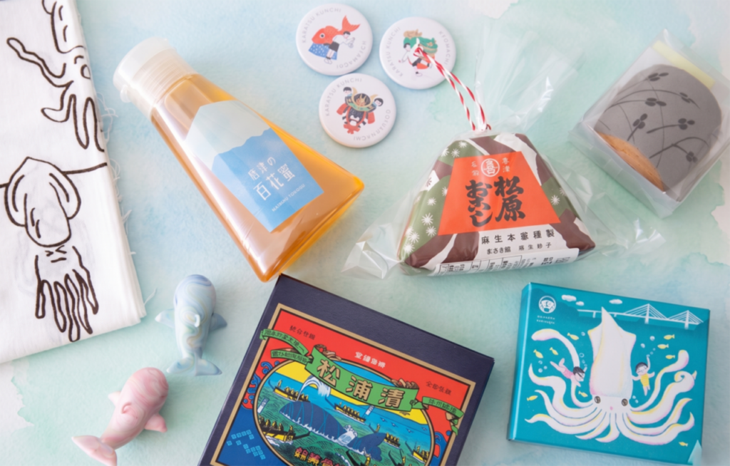 唐津くんちをモチーフにしたオリジナルグッズや、昔ながらの味わいの松原おこし、和柄パッケージが可愛いからつ茶、海洋プラスチックを再生した話題のアップサイクルアイテムなど、思わず手に取りたくなるアイテムたちです。