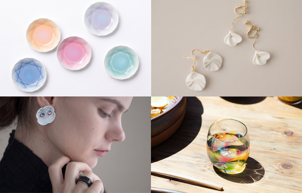 有田や伊万里をはじめ、佐賀県内各地から届いた、日常に取り入れやすい器やガラスのアイテムもセレクト。「Incomplete Collection」や「Arita Jewel」といった絵付けや釉薬を現代的に楽しめる有田焼の豆皿シリーズや、二位関めぐみさんの陶磁器アクセサリー、畑萬陶苑×YURAIのジュエリー、「副島硝子」の肥前びーどろなど、産地ごとの個性を気軽に楽しめるラインナップが揃います。