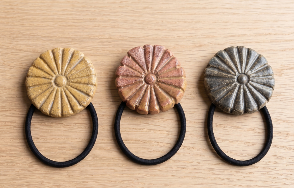今回限定入荷するのは、そんな黒唐津や茜唐津を気軽に楽しめるヘアゴム。さりげなく取り入れられる小さなかたちの中にも、土の質感や釉薬の表情が感じられ、和装やドレスアップの際の髪飾りとしても人気です。