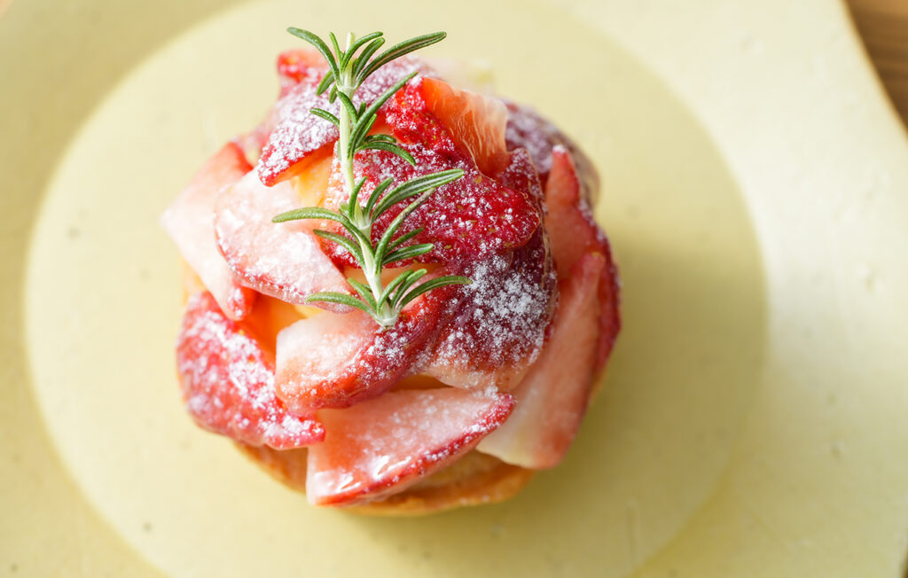 食後のデザートにオススメしたいのが、ゴールデンウィーク限定でリバイバル登場する佐賀県産苺「いちごさん」のタルトです。こちらもサダムさんの器で提供されます。