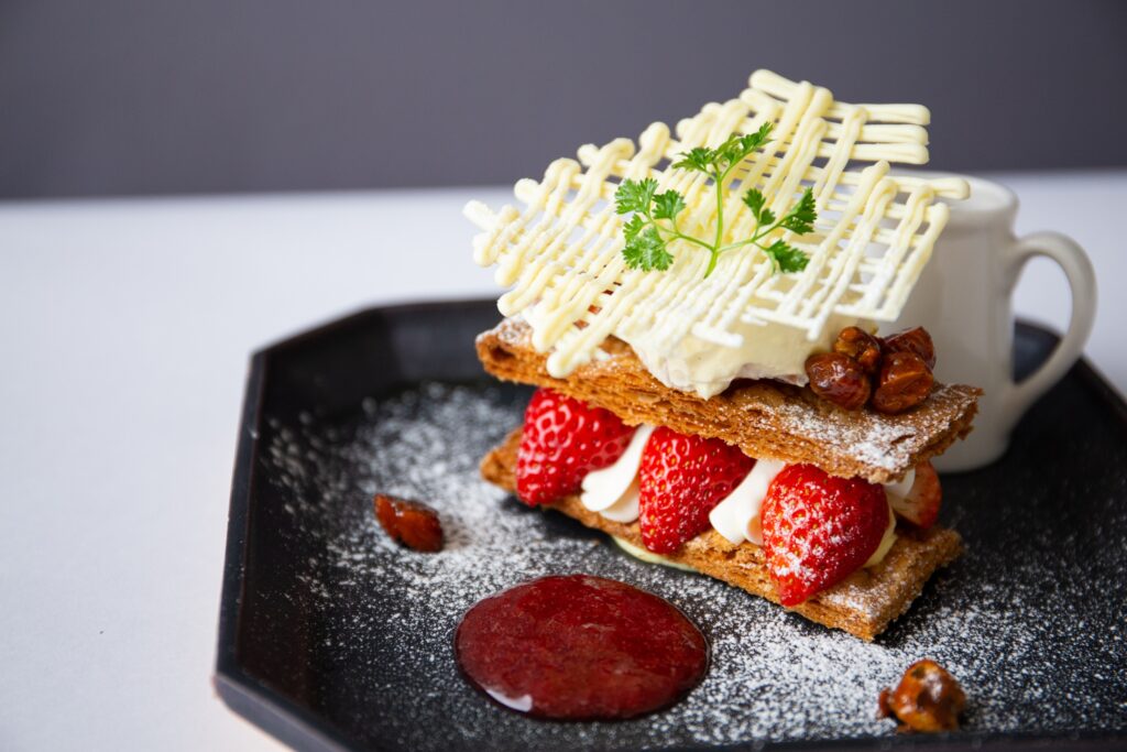 さらに、同じく「いちごさん」のミルフィーユには「三藤窯」三藤るいさん、地元ブランド「みのり農場」の卵を使ったクロワッサンサンドには「赤水窯」熊本象さんの器を使用するなど、 随所に器とのコラボレーションが散りばめられています。