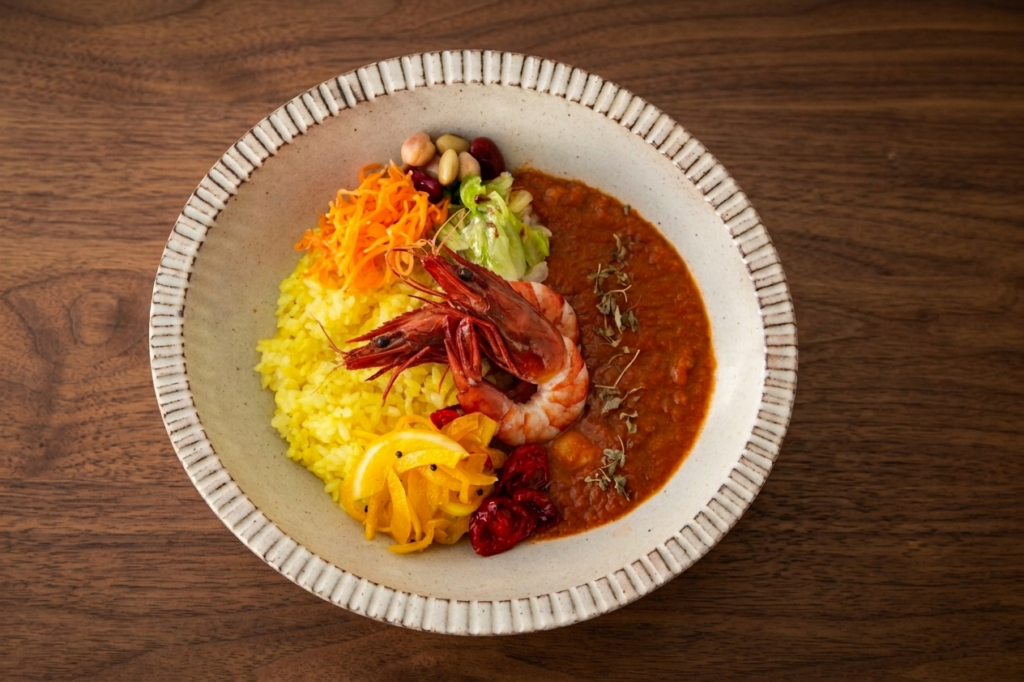 一口運ぶと、まず広がるのは濃厚な魚介の旨み。ベースとなるのは、エビ、イカ、アサリなどの魚介の旨みを丁寧に引き出したブイヤベースです。そこに玉ねぎ、ニンジン、セロリといった唐津野菜の甘味を重ね、さらに魚介の旨みを最大限に引き立てるコリアンダーをはじめとする7種のスパイスで奥行きを加えました。ニンニクやトマトのコク、3種のハーブが効いて、味わいが幾層にも広がっていきます。
