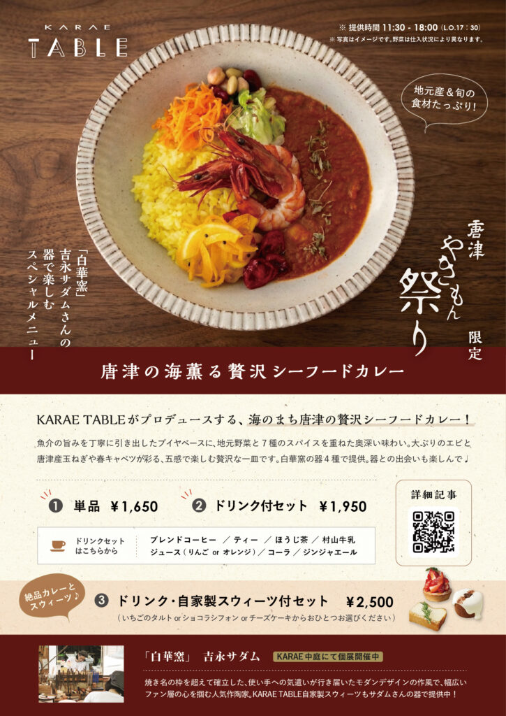 ゴールデンウィーク、唐津のまちなかが賑わう恒例イベント「唐津やきもん祭り」。旬の地元食材を唐津の焼物文化とともにお届けするカフェ&レストラン「KARAE TABLE」では、五感を満たす「食と器」の特別なマリアージュ企画を開催します。今年の主役は、KARAE TABLEが自社開発した、 五感で味わう「唐津の海薫る贅沢シーフードカレー」 です。